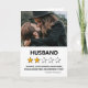 Funny valentines day card featuring a photo of you and your partner, the word "Husband", with a 2 star review, the comment "burper, loud snorer, handyman, would sometimes recommend them", and your name. Can also be changed for a girlfriend, boyfriend or wife.