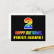 The front of this cheerful, fun, and colourful birthday themed postcard design features a large number "2" and the message "HAPPY BIRTHDAY,", both having a rainbow spectrum gradient inspired pattern colouring, along with a bold yellow customizable recipient name. The front also has a minimalist black coloured background. The back of the postcard has a customizable birthday greeting message, or could perhaps be cleared and left blank if a message is to be written by hand instead. A colourful personalized birthday postcard like this might be a fun way to send a message celebrating somebody’s second birthday. [~Z0000474]