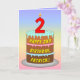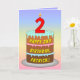This upbeat and fun birthday themed greeting card design features a cartoon-style depiction of a three-tier birthday cake having a numeral-shaped candle on top showing the number “2“, along with the message “HAPPY 2ND BIRTHDAY,”, and a personalized recipient name. The background of the front features a multicolored pastel rainbow spectrum inspired gradient pattern. The inside has a personalized birthday greeting message, or could perhaps be cleared and left blank if a message is to be written by hand instead. A joyful, customizable birthday greeting card like this might be a fun way to send some birthday wishes to somebody who is celebrating their second birthday. [~Z0000625]