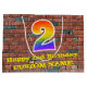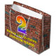 This colourful and vibrant birthday themed gift bag design, inspired by street art, features a large number "2" with a rainbow spectrum gradient inspired pattern, along with the message "Happy 2nd Birthday,", and an editable name. It also has a brick wall inspired pattern background. A birthday themed giftbag like this might be a fun way to wrap a gift or present being given to celebrate somebody’s second birthday. [~Z0000522]