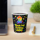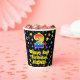 This exciting and cheerful birthday-themed paper cup design features a large number “2” having a rainbow spectrum gradient inspired pattern. It also features the message “Happy 2nd Birthday,”, and a personalized name. The background features an exciting and colourful pattern featuring many star shapes with different colours and sizes. Colourful, vibrant paper cups like this might be fun to use at a birthday party being held to celebrate somebody’s 2nd birthday. [~Z0000540]