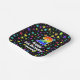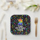 This fun and exciting birthday themed paper plate design features a large number “2” with a rainbow spectrum gradient inspired pattern, along with the message “Happy 2nd Birthday,”, and a custom name. The background features a colourful pattern having many star shapes with different sizes and colours. Birthday themed paper plates like this might be used at a party celebrating somebody’s 2nd birthday. [~Z0000582]