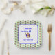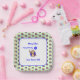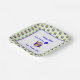 A square shaped birthday plate for a two year old, which co-ordinates with the round version. All items of text can be personalized: Name, caption, greeting. The design features a smiling monkey with a bright blue balloon which has the figure 2 on it. A further pattern of monkeys on a pale green background decorates the edge of the plate.