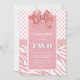 A pink and white 2nd birthday invitation featuring a festive bow, polka dots, and zebra stripes while the text is framed with a faux glitter border. The TWO is filled with festive polka dots, perfect for your special occasion.