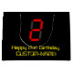 This nerdy and silly birthday themed gift bag design features a large number "2" with a red seven segment digital display style appearance, along with the message "Happy 2nd Birthday," and a personalized name in geeky yellow text, on a black coloured background. A personalized gift bag like this might be used when wrapping presents or gifts being given in honour of somebody’s second birthday. [~Z0000389]