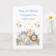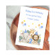 This blue watercolour 2nd birthday card is suitable for twins or a single child. The design includes a birthday number 1, balloons, stars, a giraffe, an elephant wearing a party hat, and a lion wearing a party hat. All text is fully customisable.