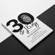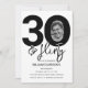 Stylish editable 30th birthday invitation featuring, 30 & flirty, a large 30 with a photo inside the zero, with black font over a classic white background and a birthday celebration template that is easy to personalize.