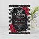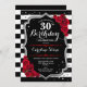 30th Birthday Invitation Elégant design noir blanc rouge avec fausse parties scintillant. Bandes noires et blanches avec roses rouges. Parfait pour une soirée d'anniversaire élégante.