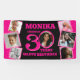 Cheers to 30 years, 30th Birthday pink text, name and seven photos banner. Fun bright thirtieth birthday banner, personalize with a photograph of the birthday girl in the middle of the number 0 and add your own six photos around the edge. Great idea for adding some fun to a pink milestone 30th birthday party celebration. Other matching items and colours options are available. Exclusive design by Sarah Trett for www.mylittleeden.com
