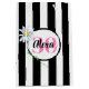 White daisy on black and white striped pattern with name and age for 30th birthday.