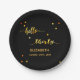Elegant and modern for a 30th birthday party. Chic black backdrop and faux gold text written with a trendy hand-lettered style script: hello thirty. With golden dots as decor. Templates for a name and date, golden letter.