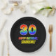 This cheerful, fun, and colourful birthday-themed paper plate design features a large number "30" and the message "HAPPY BIRTHDAY,", both coloured with a rainbow spectrum gradient inspired pattern, along with a bold yellow customizable name. The background is coloured black. Fun, customizable paper plates like this might be used at a party being held to celebrate somebody’s thirtieth birthday. [~Z0000488]