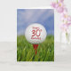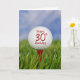 Close up of a white golf ball on a red tee in grass with sky background for 30th birthday.