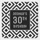 Cool birthday stickers read, "[NAME]'s 30th Birthday" in a trendy white font on a black square with a modern black and white geometric pattern around the border. Customize the name and age (if needed) in the sidebar for any birthday by year celebration. Black meanders angle around white diamonds containing black diamonds. White zigzags provide subtle separation between the winding paths. They make great envelope seals and wrapping decorations.