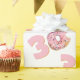 Bite out of a doughnut with pink icing and candy sprinkles on white for 30th birthday.