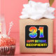 This colourful, cheerful, and fun birthday sticker design features a large number "31" and the message "HAPPY BIRTHDAY,", both having a rainbow spectrum gradient inspired pattern colouring, along with a bold yellow editable name. The background is coloured black. Fun stickers like this might be used when wrapping presents being given to somebody in celebration of their 31st birthday, or perhaps might be handed out to the guests at a birthday party or celebration. [~Z0000480]