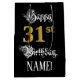 This luxurious and elegant birthday themed giftbag design features the message “Happy 31st Birthday,”, and an editable recipient name. Some of the message is in a fancy script-style text, the large number “31st” features a faux/imitation gold-inspired look pattern, and the background is coloured black. An ornate giftbag like this might be used when giving a gift or present in honour of somebody’s 31st birthday. [~Z0000560]
