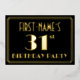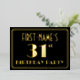 The front of this vintage-style and 1920s/1930s style inspired thirty-first birthday celebration foil invitation features an editable name, a large art deco style inspired number “31st”, the message “BIRTHDAY PARTY”, and a border pattern consisting of lines. The front also has a black-coloured background by default, but it can be customized to a different colour if desired. The back features personalized details about the event, such as the date, time, venue, and any other information that may be important. Luxurious, elegant, customized invitations like these might be used to invite guests to a birthday gathering/party being held to celebrate somebody’s 31st birthday. [~Z0000591]