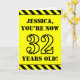 The front of this bold and attention-grabbing birthday-themed greeting card design features a personalized name and the message "YOU’RE NOW 32 YEARS OLD!" in black stencil style text on a yellow coloured background. The front also features an eye-catching yellow and black striped pattern at the top and bottom edges. The inside features an editable birthday greeting message, or could perhaps be cleared and left blank if a message is to be written by hand instead. A customizable birthday card like this might be a fun way to send a message in celebration of somebody’s thirty second birthday. [~Z0000413]