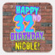 This fun birthday square sticker design features the message “HAPPY 32ND BIRTHDAY,” having a colourful, vibrant, graffiti and urban street art inspired look, plus a custom recipient name. The background features a brick wall inspired pattern. Fun, personalized stickers like this might be given as a birthday present, or used while wrapping gifts, or perhaps used as a birthday party decoration when celebrating somebody’s thirty second birthday. [~Z0000535]