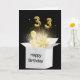 Gold balloons and sparkling light beams glow in a white box on black background for 33rd birthday