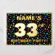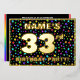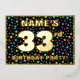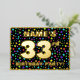 The front of this upbeat thirty-third birthday party foil invitation card design features a custom name, a large number “33rd”, the message “BIRTHDAY PARTY!”, and a border. The background of the front has a joyful, multicolored pattern of star shapes. The back features personalized details about the event, such as the date, time, place, and any other information that may be important. Personalized invitations like these might be a fun way to invite guests to a birthday party/gathering being held in celebration of somebody’s 33rd birthday. [~Z0000600]