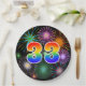 This fun, cheerful, and colourful paper plate design features a large number "33" coloured with a rainbow spectrum gradient inspired pattern. It also features a exciting and vibrant bursting celebratory fireworks inspired pattern. It has a black coloured background. Paper plates like this might be fun to use at a party being held to celebrate somebody’s 33rd birthday, a thirty third anniversary, or some other thirty third event. [~Z0000490]