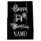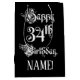 This elegant and ornate birthday themed giftbag design features the message “Happy 34th Birthday,” in formal script style text, on a black coloured background. It also has a personalized recipient name. An opulent gift-bag like this might be a respectable way of wrapping a birthday present or gift being given to somebody who is celebrating their 34th birthday. [~Z0000557]