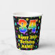 This exciting and joyful birthday paper cup design features a large number “34” having a rainbow spectrum gradient inspired pattern. It also features the message “Happy 34th Birthday,”, and a custom name. The background features a multicolored pattern having many star shapes with different sizes and colours. Colourful, vibrant paper cups like this might be fun to have at a birthday party/celebration being held in celebration of somebody’s thirty fourth birthday. [~Z0000540]