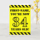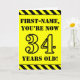 The front of this bold and fun birthday-themed greeting card design features a personalized name and the message "YOU’RE NOW 34 YEARS OLD!" in black stencil look text on a yellow colored background. There is also an eye-catching black and yellow stripes pattern at the top and bottom edges of the front. The inside features a personalized birthday greeting message, or could perhaps be cleared and left blank if a message is to be written by hand instead. A personalized birthday card like this might be a fun way to send birthday wishes to somebody who is celebrating their thirty fourth birthday. [~Z0000413]