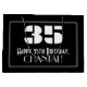 This vintage style 1920s/1930s appearance inspired birthday themed gift bag design features a large art deco style inspired number "35", the message "Happy 35th Birthday,", a personalized name, and a border pattern consisting of thin lines. It features a black-coloured background. A gift bag like this might be used when wrapping gifts being given to somebody in celebration of their thirty fifth birthday. [~Z0000495]