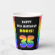 This joyful and cheerful birthday paper cup design features the number “35“ with a multicolored rainbow spectrum inspired gradient pattern, along with the message “HAPPY 35th BIRTHDAY,”, and a personalized recipient name. Birthday themed paper cups like this might be used at a birthday party celebrating somebody’s thirty fifth birthday. [~Z0000639]