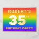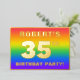 The front of this eye-catching and exciting thirty-fifth birthday party/celebration foil invitation card design features a personalized name, a large number “35th”, the message “BIRTHDAY PARTY!”, and a border. The background of the front has an upbeat, multicolored, rainbow spectrum inspired gradient pattern. The back features personalized details about the event, such as the date, time, place, and any other information that may be relevant. Customized invitations like these might be a fun way to invite attendees to a birthday party being held to honour somebody’s 35th birthday. [~Z0000599]