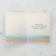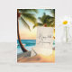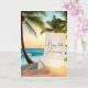 A blank invitation paper with an envelope rests on a sandy beach against the backdrop of gently swaying palm trees and a serene ocean under a vibrant sunset for 35th anniversary.