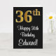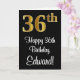 This stylish, sophisticated, and elegant birthday-themed greeting card design features a large ordinal number “36th” having an imitation/faux gold-like gradient pattern, plus the birthday greeting message “Happy 36th Birthday,” and an editable name in a script-style font on the front. It also has a black-coloured background on the front. The inside has a customized birthday greeting message, or could perhaps be cleared and left blank if a message is to be written by hand instead. A luxurious personalized birthday greeting card like this might be used to celebrate somebody’s thirty-sixth birthday. [~Z0000518]
