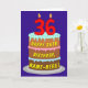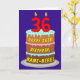 This cheerful and joyful birthday-themed greeting card design features a depiction of a three-tier birthday cake having numeral-shaped candles on top showing the number “36“, along with the message “HAPPY 36TH BIRTHDAY,”, and a personalized recipient name. The inside has a customizable birthday greeting message, or could perhaps be cleared and left blank if a message is to be written by hand instead. An upbeat, editable birthday greeting card like this might be sent in celebration of somebody’s thirty-sixth birthday. [~Z0000620]