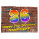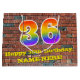 This fun and colourful birthday gift bag design, inspired by urban art and graffiti, features a large number "36" with a rainbow spectrum gradient inspired pattern, along with the message "Happy 36th Birthday,", and a custom name. The background features a brick wall style pattern. A gift bag like this might be a fun way of wrapping a birthday present or gift being given to somebody who is celebrating their thirty sixth birthday. [~Z0000522]