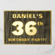 The front of this bold thirty-sixth birthday celebration foil invitation card features an editable name, a large number “36th”, the message “BIRTHDAY PARTY!”, and a border, all in foil. There is a rustic, yet elegant, faux wood grain look inspired pattern for the background of the front. The back features personalized details about the event, such as the date, time, venue, and any other useful information. Customizable invitations like these might be used to invite guests/attendees to a birthday party/gathering being held to honour somebody’s 36th birthday. [~Z0000598]
