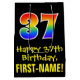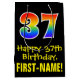 This colourful, fun, and exciting birthday-themed gift bag design features a large number "37" with a rainbow spectrum gradient inspired pattern, along with the message "Happy 37th Birthday,", and a personalized recipient name. The background is coloured black. A fun gift bag like this might be used when wrapping presents being given to somebody in celebration of their thirty seventh birthday. [~Z0000512]