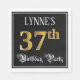 This ornate and fancy birthday themed paper napkin design features an editable name and the message “37th Birthday Party”. The large number “37th” has a faux/imitation gold-inspired coloring pattern, the words “Birthday Party” are in elegant script-style text, and the background is colored black by default (although it can be customized). Luxurious, elegant paper napkins like this might be useful at a birthday party/celebration being held to honor somebody’s 37th birthday. [~Z0000565]