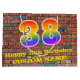 This fun and colourful birthday-themed gift bag design, inspired by street art and graffiti, features a large number "38" with a rainbow spectrum gradient inspired pattern, along with the message "Happy 38th Birthday,", and a custom name. The background features a brick wall style pattern. A giftbag like this might be a fun way of wrapping a birthday present or gift being given to somebody who is celebrating their thirty eighth birthday. [~Z0000522]