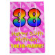 This loving, upbeat, and cheerful birthday-themed giftbag design features a large number "38" with a rainbow spectrum gradient style pattern, along with the message "Happy 38th Birthday,", and a custom recipient name. It also has a fun background pattern featuring pink-coloured heart shapes and stripes. A happy gift bag like this might be used when wrapping presents being given to somebody in celebration of their 38th birthday. [~Z0000511]