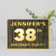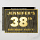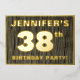 The front of this bold thirty-eighth birthday celebration/party foil invitation card features an editable name, a large number “38th”, the message “BIRTHDAY PARTY!”, and a border, all in foil. There is a rustic, yet sophisticated, faux wood grain look inspired pattern for the background of the front. The back features personalized details about the event, such as the date, time, venue/place, and any other information that may be relevant. Editable invitations like these might be used to invite attendees to a birthday gathering being held to celebrate somebody’s 38th birthday. [~Z0000598]