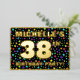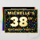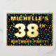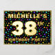 The front of this exciting thirty-eighth birthday party/celebration foil invitation card design features an editable name, a large number “38th”, the message “BIRTHDAY PARTY!”, and a border. The background of the front has a joyful, multicolored stars pattern. The back features personalized details about the event, such as the date, time, place/venue, and any other important information. Customizable invitations like these might be a fun way to invite guests to a birthday gathering/party being held to honour somebody’s 38th birthday. [~Z0000600]