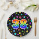 This fun, colourful, and cheerful paper plate design features a large number "38" coloured with a rainbow spectrum gradient inspired pattern. The background features a colourful pattern of star shapes. Fun paper plates like this might be used at somebody’s thirty eighth birthday party, or a couple’s thirty eighth anniversary celebration, or some other thirty eighth event. [~Z0000493]