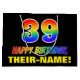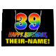 This cheerful, colourful, and fun birthday-themed gift bag design features a large number "39" and the message "HAPPY BIRTHDAY,", both coloured with a rainbow spectrum gradient inspired pattern, along with a bold yellow personalized recipient name. The background is coloured black. A fun birthday themed gift bag like this might be used to wrap a gift or present being given to somebody who is celebrating their 39th birthday. [~Z0000477]