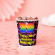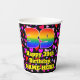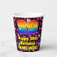 This colourful and fun birthday themed paper cup design features a large number “39” having a rainbow spectrum gradient inspired pattern. It also features the message “Happy 39th Birthday,”, and a personalized name. The background features a pattern of red, pink, and purple heart shapes. Happy, friendly paper cups like this might be fun to have at a birthday party being held in celebration of somebody’s thirty ninth birthday. [~Z0000548]