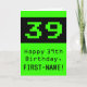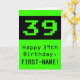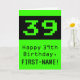 This fun and nerdy birthday themed greeting card design features a large green retro computer game style number "39" on the front. It also features the birthday greeting message "Happy 39th Birthday,", and a customizable name. The inside features a personalized birthday greeting message, or could perhaps be cleared and left blank if a message is to be written by hand instead. A silly and nerdy birthday greeting card like this might be used to send birthday wishes to somebody who is celebrating their thirty ninth birthday and who really likes video gaming. [~Z0000430]