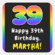 This cheerful and fun birthday-themed square sticker design features a large number “39“ having a colorful rainbow spectrum inspired gradient pattern, along with the message “Happy 39th Birthday,”, and a personalized recipient name. Eye-Catching birthday themed stickers like these might be given out or used at a birthday party celebrating somebody’s 39th birthday, or perhaps used when preparing presents or invitations for such an event. [~Z0000630]