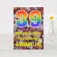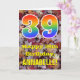 The front of this colourful, autumn-themed, and rustic birthday greeting card design features a large number "39" with a rainbow spectrum gradient inspired pattern, along with the message "Happy 39th Birthday,", and an editable name. The background of the front of the card features a rustic fallen autumn leaves pattern. The inside features a customizable birthday greeting message, or could perhaps be cleared and left blank if a message is to be written by hand instead. A personalized birthday card like this might be a fun way to send a message in celebration of somebody’s thirty ninth birthday. [~Z0000384]